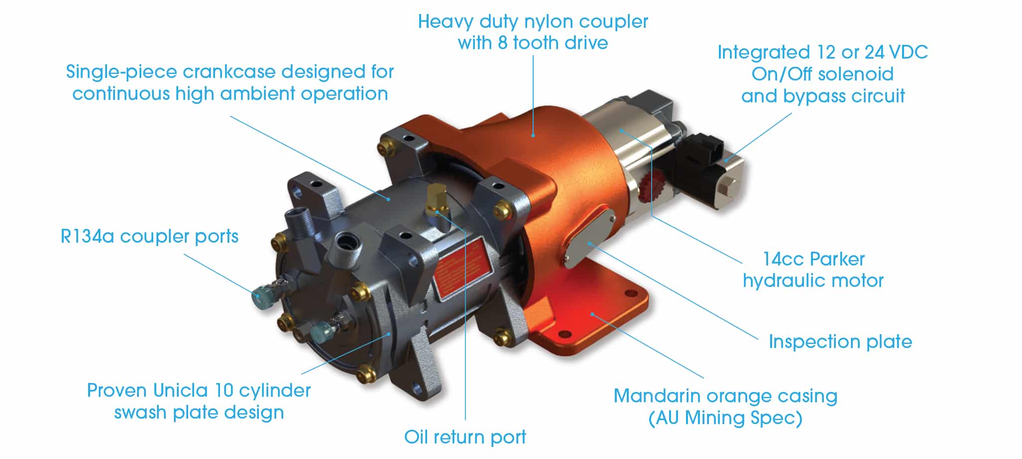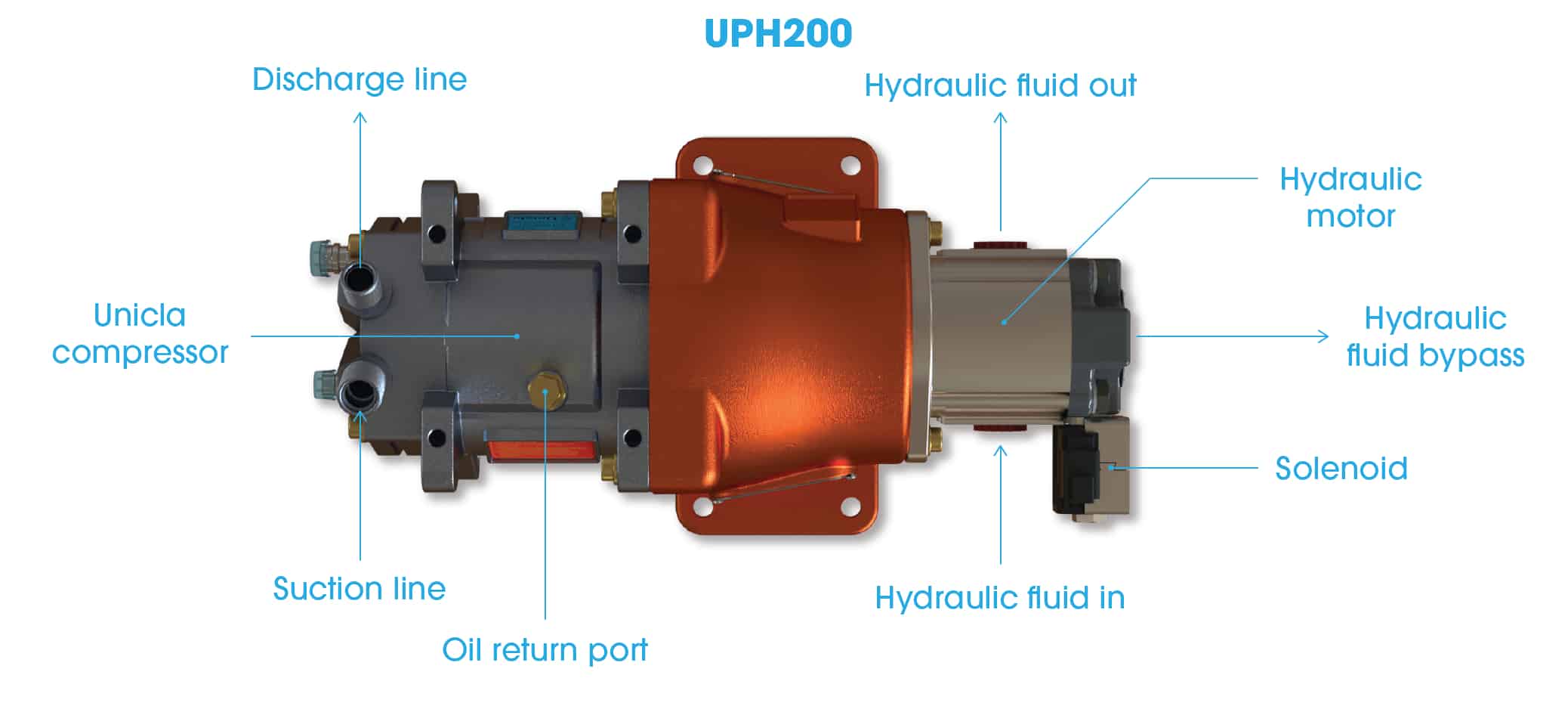 The Unicla UPH Hydraulic Drive compressors are designed for universal application and freedom of installation. The range can be driven by any 11-15cc hydraulic motor with a standard SAE twin-bolt, A-type mounting configuration, and 5/8″ nine-spline shaft.