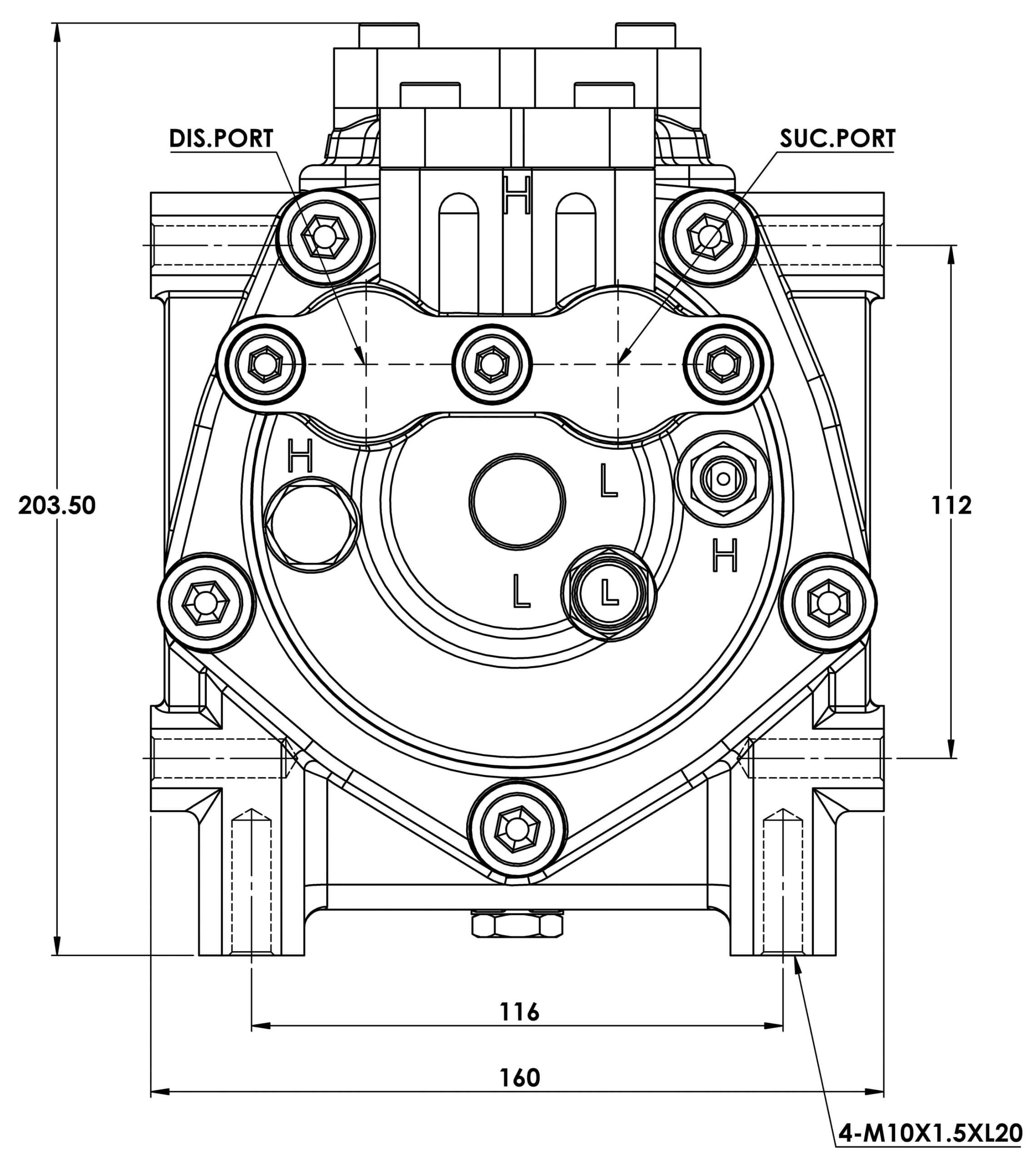 A low-side service valve is fitted to the rear cap, including a high-pressure relief valve.