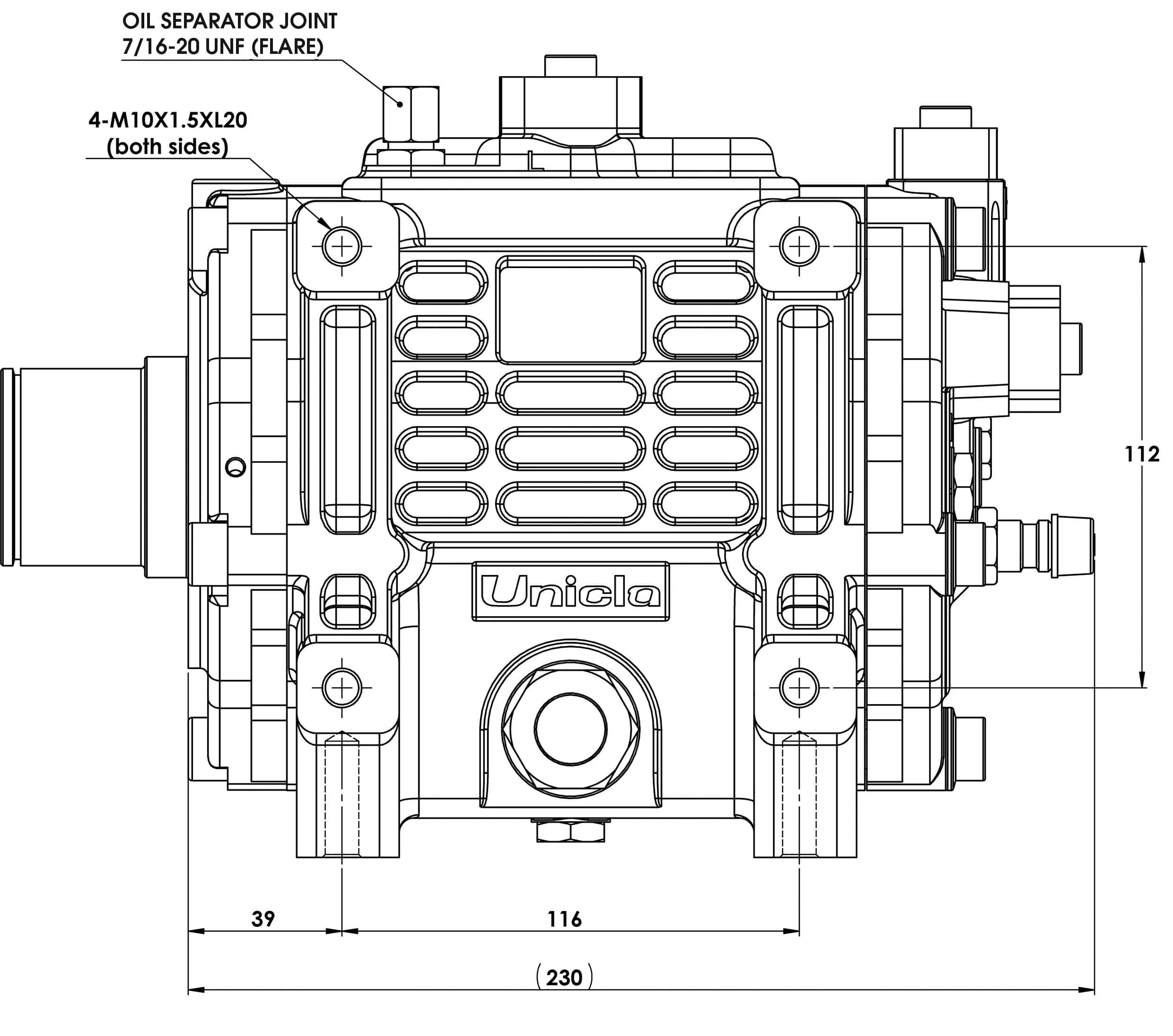 An oil return fitting – 7/16-20 UNF male flare (Part No. 42203-000160) – is fitted on top of the compressor. It has a unique flow design suited to the Unicla oil separator (Part No. OS000030) and is interchangeable with the low-side service valve.