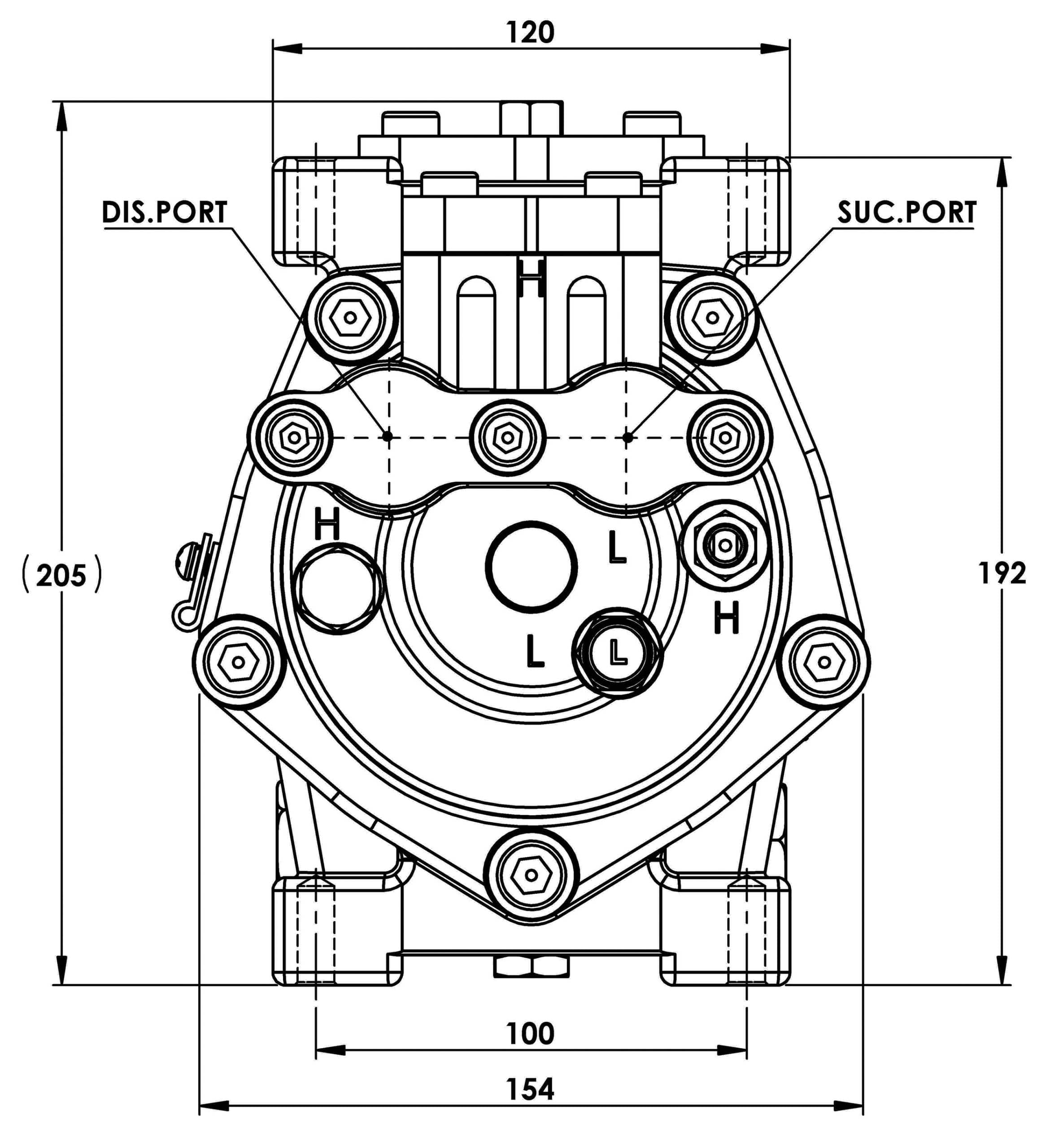 A low-side service valve is fitted to the rear cap, including a high-pressure relief valve.