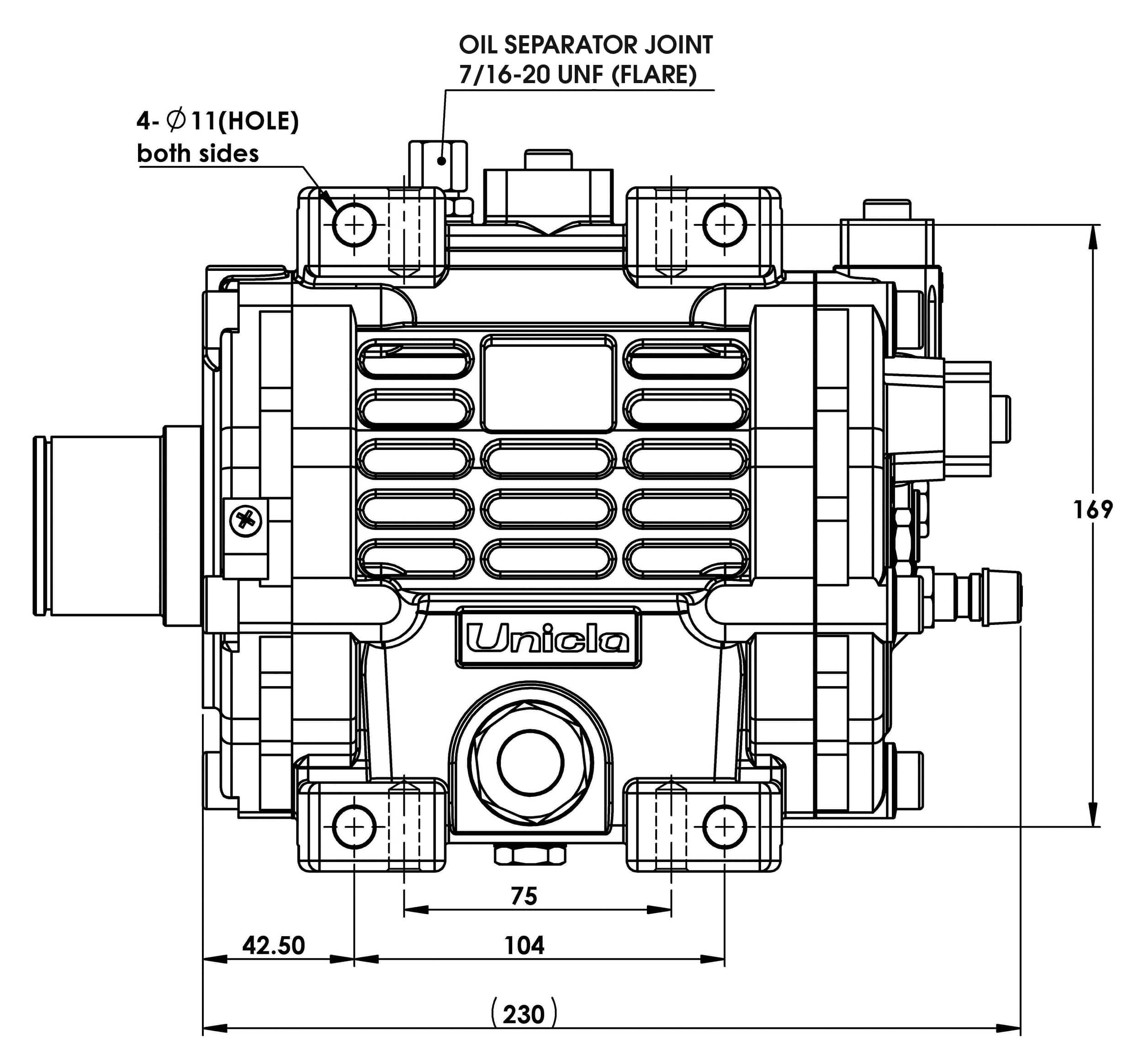 An oil return fitting – 7/16-20 UNF male flare (Part No. 42203-000160) – is fitted on top of the compressor. It has a unique flow design suited to the Unicla oil separator (Part No. OS000030) and is interchangeable with the low-side service valve.